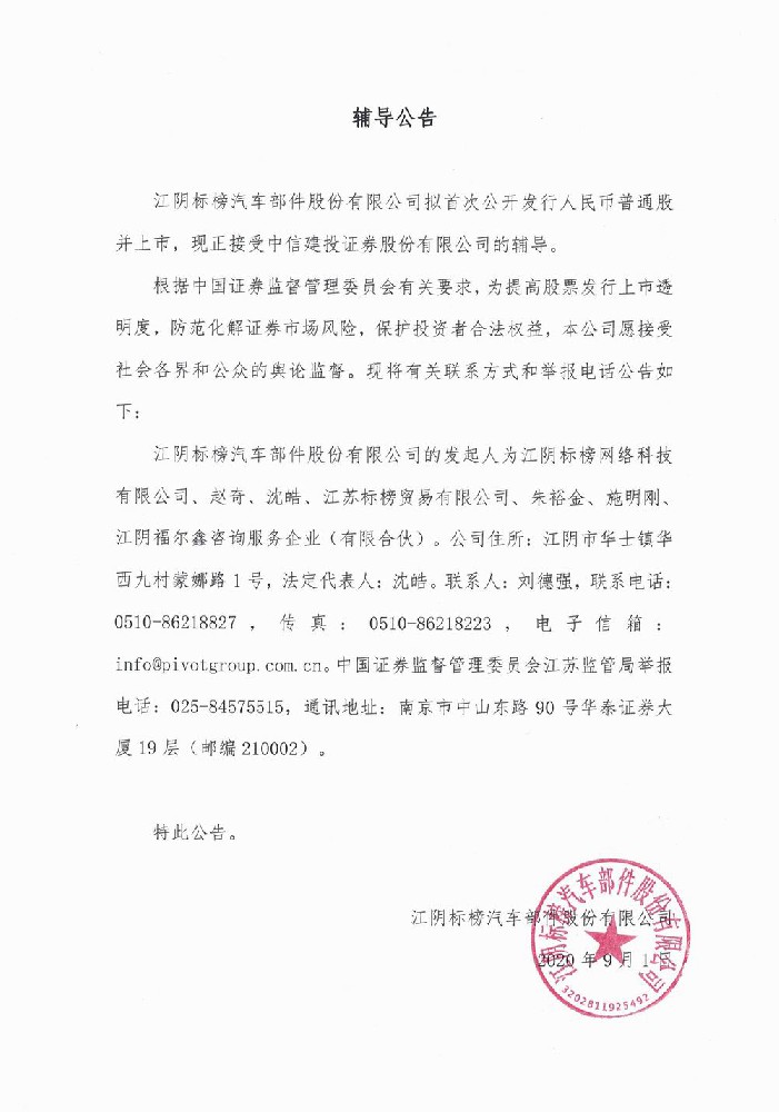 江陰標榜汽車部件股份有限公司擬首次公開發行人民幣普通股并上市,現正接受中信建投證券股份有限公司的輔導。