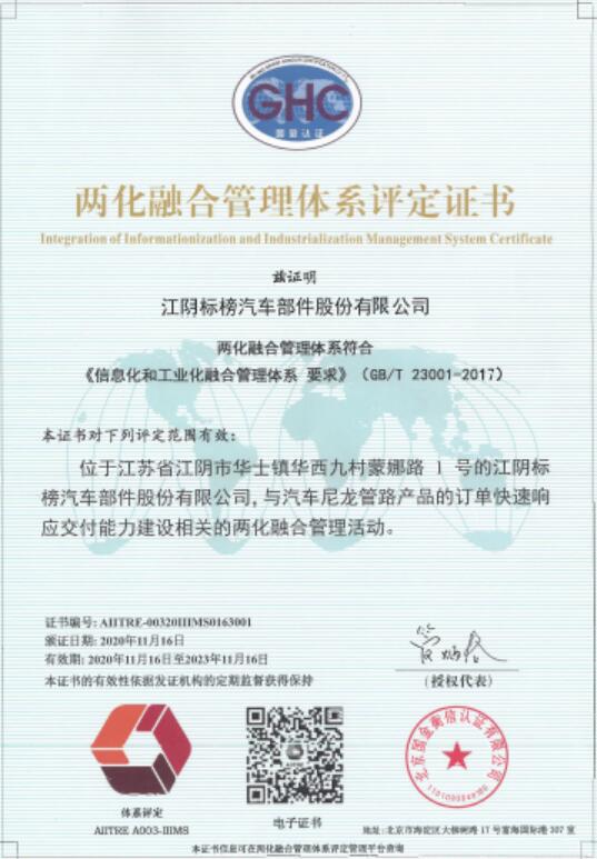 近日,公司順利通過兩化融合管理體系評定,并獲得評定證書。